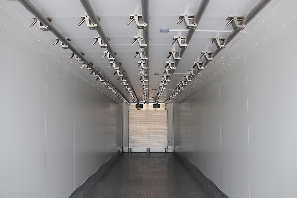 Кузов полуприцепа Тонар-9746Т усиленный для транспортировки мясных туш в повешенном состоянии.