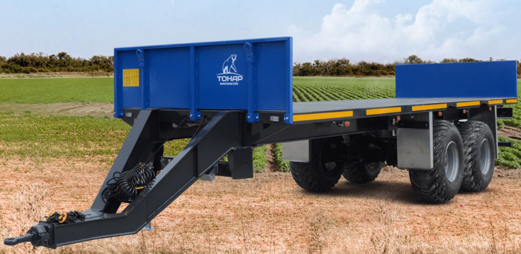 Тракторный прицеп с длиной платформы 7500 мм, предназначен для перевозки овощных контейнеров и цилиндрических тюков сена (соломы).