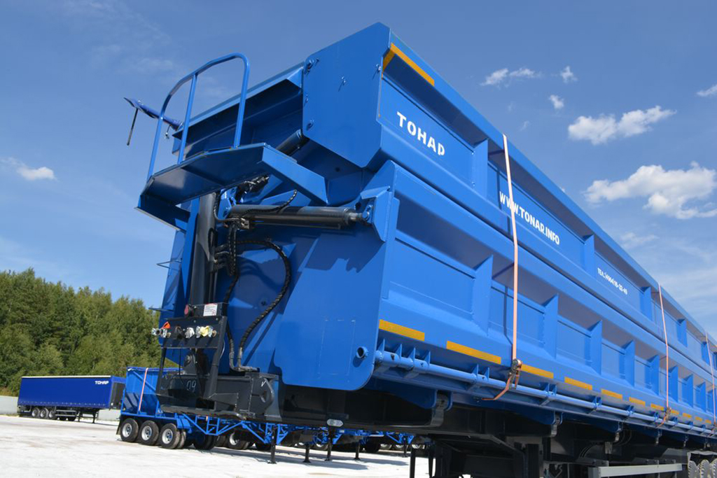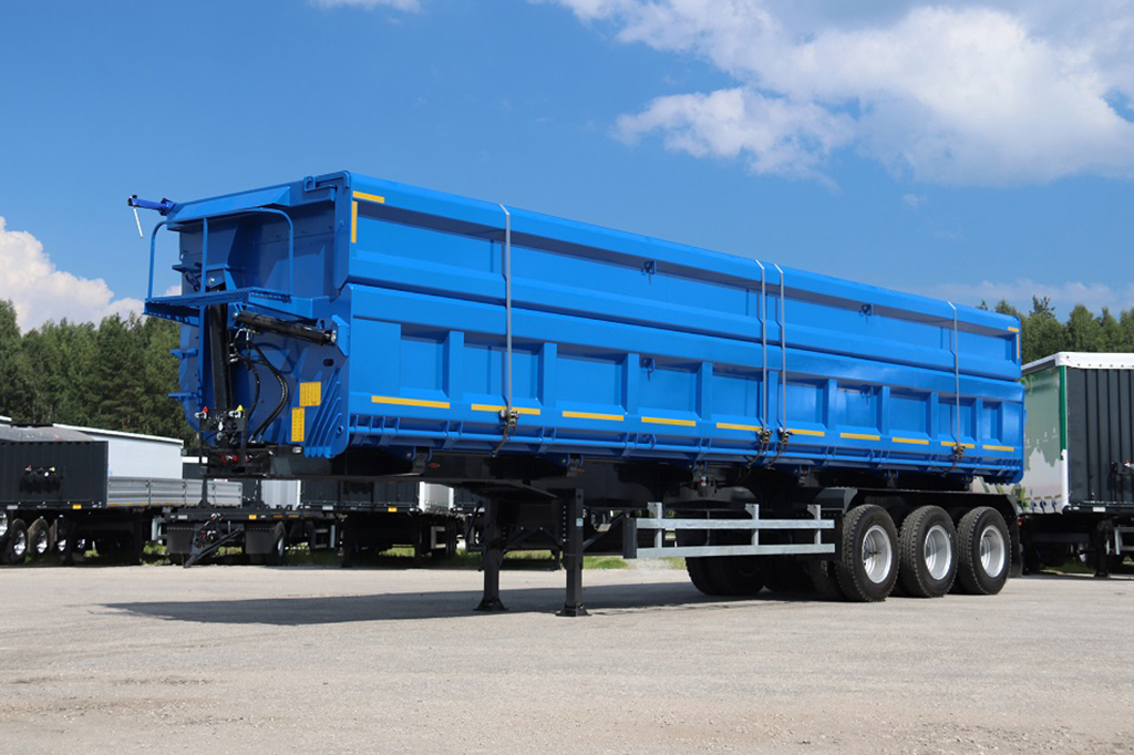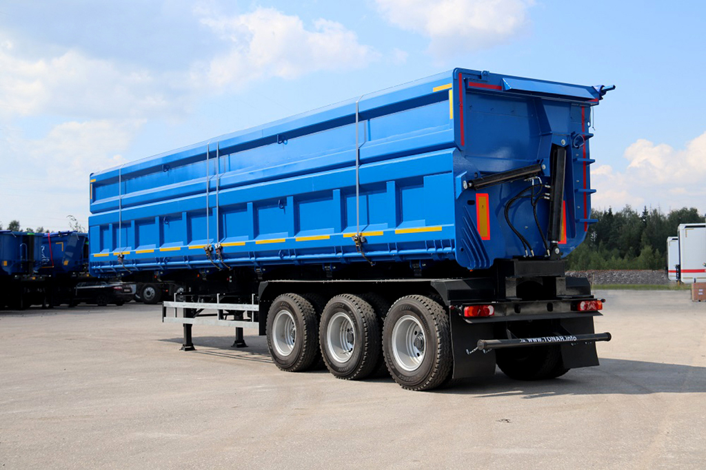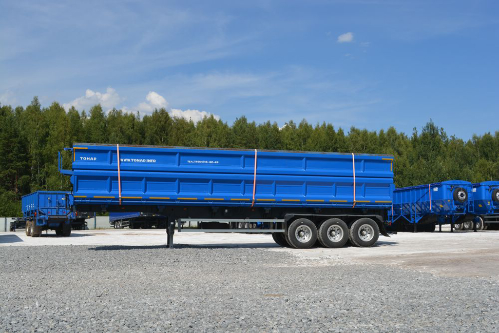 Трехосный полуприцеп-самосвал Тонар-95236. Грузоподъемность этой модели до 65 000 килограммов, объём - 61 куб.м.