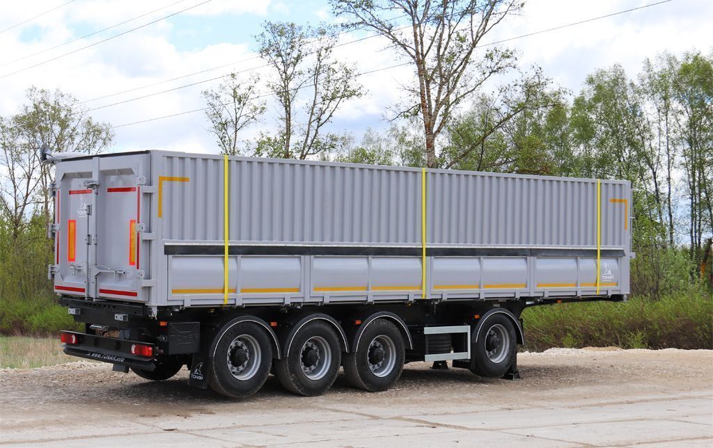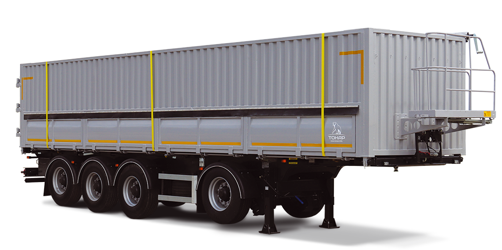 Кузов прямоугольной формы выполнен из профилированного прокатного листа и оснащен защитным тентом с механическим приводом. На каждой стороне кузова расположено по 4 разгрузочных лючка. Разгрузка полуприцепа осуществляется на боковые стороны посредством двух подпольных гидроцилиндров.